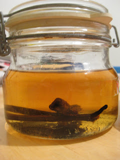 Joulupukki toi hieman myöhässä ah niin ihanan Nigella Lawsonin kirjan How to be domestic goddess - Baking and the art of comfort cooking ja nyt en ole tehnytkään pariin päivään muuta kuin selaillut sen ihania reseptejä. Suklaamoussekakkua uskalsin jo yrittääkin (hieman kylläkin epäonnistuen...) ja ohjeessa oli vaniljauute yhtenä ainesosana. Näin näytti olevan myös aika monessa muussakin ohjeessa. Koska oli loppiainen ja mie oon aika laiskiainen eli en jaksanut lähteä keskustaan asti kauppaan, joten teen mitä kuka tahansa pikku nörtti tekee -googletin! Täältä löytyikin sopiva ohje ja hyllystä hieman vodkaakin. Vaniljatankoja hamstrasin jonkin aikaa sitten ku hermostuin kun lähikaupasta ei löytynyt, joten sekin onnistui. Vaniljauute vaatii kuitenkin runsaasti aikaa, joten kakkuun hujahti puolikkaan vaniljatangon siemenet.