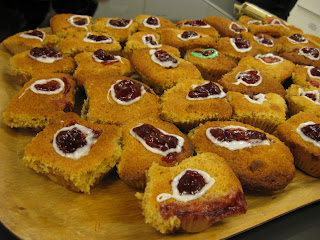 Mutta siis itse herkutteluun. Tiistaina oli osakunnan kokous, jonne tehtiin Runebergin torttuja. Mie olin ajatellut, että ne on jotenkin tuhottoman vaikeita tehdä, mutta ihan näppärästi ne valmistui. Joulusta oli jäänyt piparikuorrutetta, niin sillä sai kätevästi laitettua kuorruterinkulat. Samalla tehtiin pieni kokeilu, että ottaako kukaan vihreellä kuorrutettua torttua.. :) Otti! Tortuista ei tullut ihan kaikkein kauneimpia kun niitä oli niin tiiviisti pellillä, mutta ne oli erittäin hyviä kuitenkin. Ohje on luotettavasta Kotiruoka-kirjasta ja siitä tulee kymmenisen torttua.