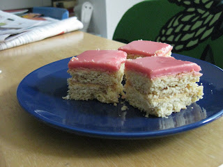 Levitä toiselle levylle ohut kerros hilloa ja siirrä toinen levy esim. paistinlastan avulla päälle. Miulla levy katkes keskeltä kun yritin käsin vain nostella. Mittaa tomusokeri kulhoon ja lisää pienissä erissä vettä tai sitruunamehua kunnes seos on paksuhkoa ja kiiltävää. Lisää halutessasi karamelliväriä veteen tai suoraan kuorrutteeseen. Levitä kuorrute leivoslevyn päälle ja anna jähmettyä hetki jääkaapissa ennen leikkaamista 5 cm x 6 cm leivoksiksi.