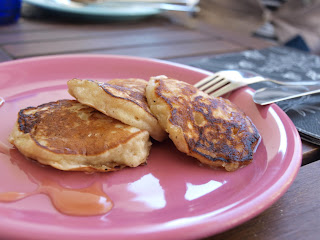 Pannarit olivat oikein herkullisia. Ohjeen mukaan päälle olisi pitänyt tehdä vaahterasiirappivoita (eli voita ja vaahterasiirappia keiteltynä), mutta mie en ilmeisesti jaksanut keitellä tarpeeksi pitkään kun siitä ei oikein tullut mitään toimivaa. Pannareiden päälle päätyi sitten ihan vaan vaahterasiirappia. Ohjeesta tulee noin 18 pannaria eli 4-6 annosta.
