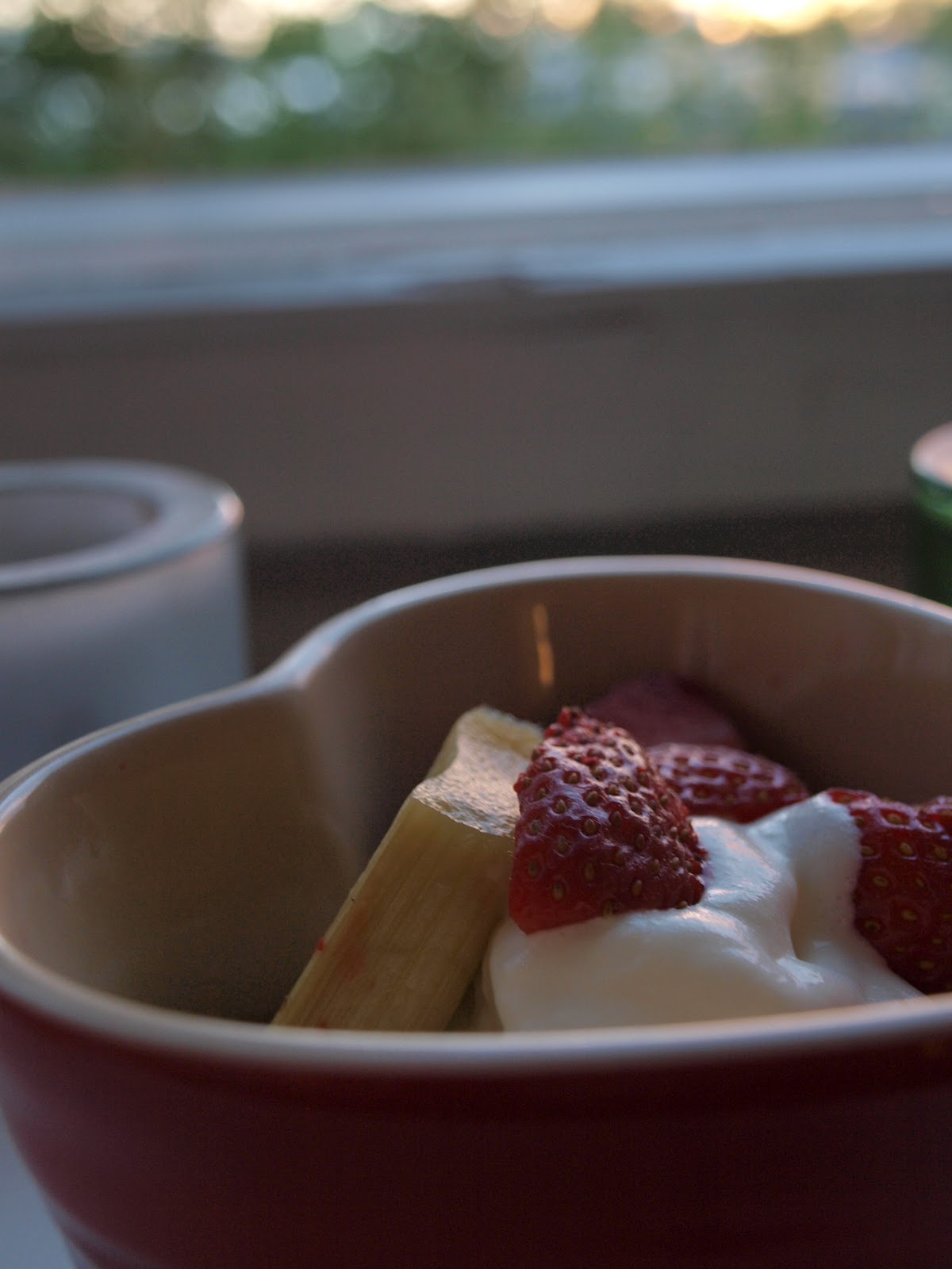 Tällä kertaa herkuttelun mahdollisti oma esimieheni, joka toi oman pihansa raparperia miulle. Osa raparpereista jäi odottamaan huomista ja osa päätyi tänään jo lautaselle. Jäi kassillisesta kyllä muillekin työkavereille. Olin päättänyt tehdä brie-mansikkasalaattia iltapalaksi, koska Vanhan terassilounaalta jäi annoskateus samaisen esimieheni popsiessa kyseistä salaattia maanantaina. Kaipailin jotain mansikkaista raparperiherkkua, jonka löysinkin Hesarin reseptihausta. Ja olipahan hyvää! Raparperi jäi sopivan rapsakaksi, mutta ei kuitenkaan liian kirpeäksi. Reseptistä tulee 4 annosta.