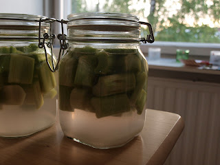 Raparperille tarvittiin lisää käyttötarkoituksia ja kerrankin miun ahkera keittokirjojen selailu palkittiin. Muistelin nähneeni raparperi-snapsin ohjeen Nigella Lawsonin How to be a domestic goddess -kirjassa, joten eikun matkalle kohti jumalattaren asemaa ja viinaostoksille.