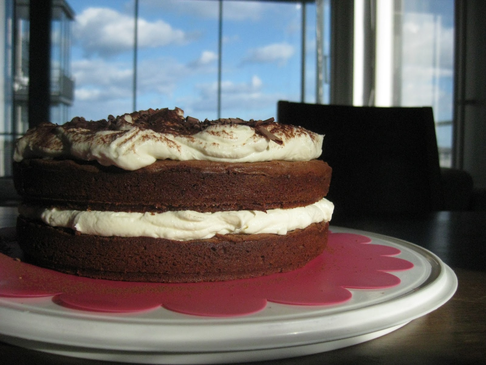 Laita leivinpaperi kahden irtovuoan pohjalle (halkaisija 20-24 cm, itse käytin yhtä 20 cm vuokaa) ja voitele vuoat. Jaa seos niihin. Paista uunin keskitasolla puolisen tuntia kunnes kakku tuntuu kypsältä. Älä pelästy vaikka kakku halkeilisikin pinnalta, päällehän tulee mascarpone-täytettä. Anna jäähtyä.