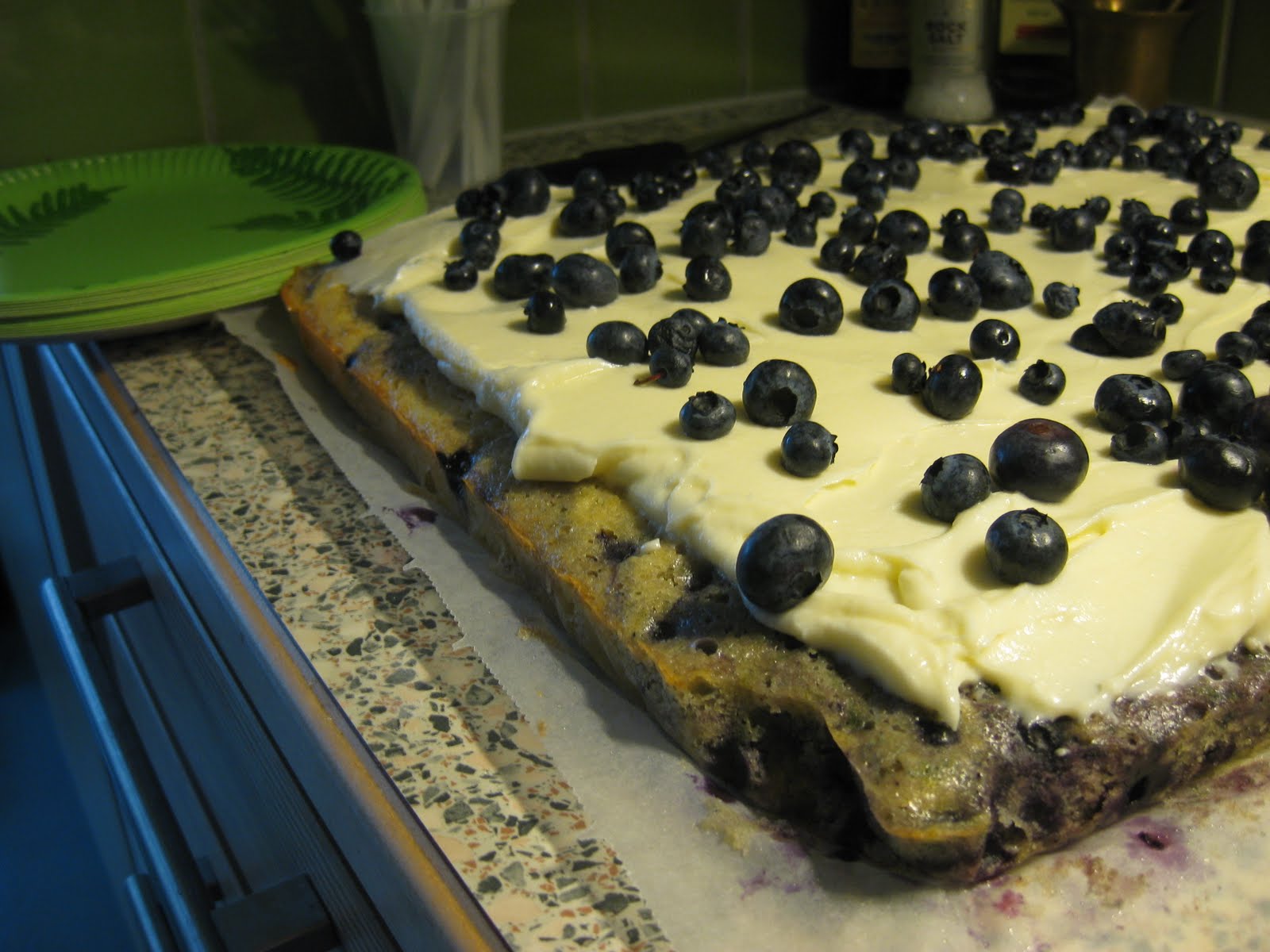 Loppu hyvin, kaikki hyvin piti jälleen paikkansa, sillä mikäs ystävän luona on leipoessa kun on hyvää seuraa ja lasissa kuohuvaa. Mustikkakakku koki muodonmuutoksen ja tein sitä pellillisen kertomalla kakun ainekset 2,5:lla ja täytteen ainekset 3:lla. Ja oli muuten todella hyvää ja mehevää ja toimi oikein hyvin isommassakin kooossa! Koristelussa käytetyt hillittömän kokoiset pensasmustikat aiheuttivat illan aikana suunnattomasti hämmästystä. Olivat oikein hienoja joo, mutta maku ei ollut yhtä hyvä kuin nortsimustikoissa.
