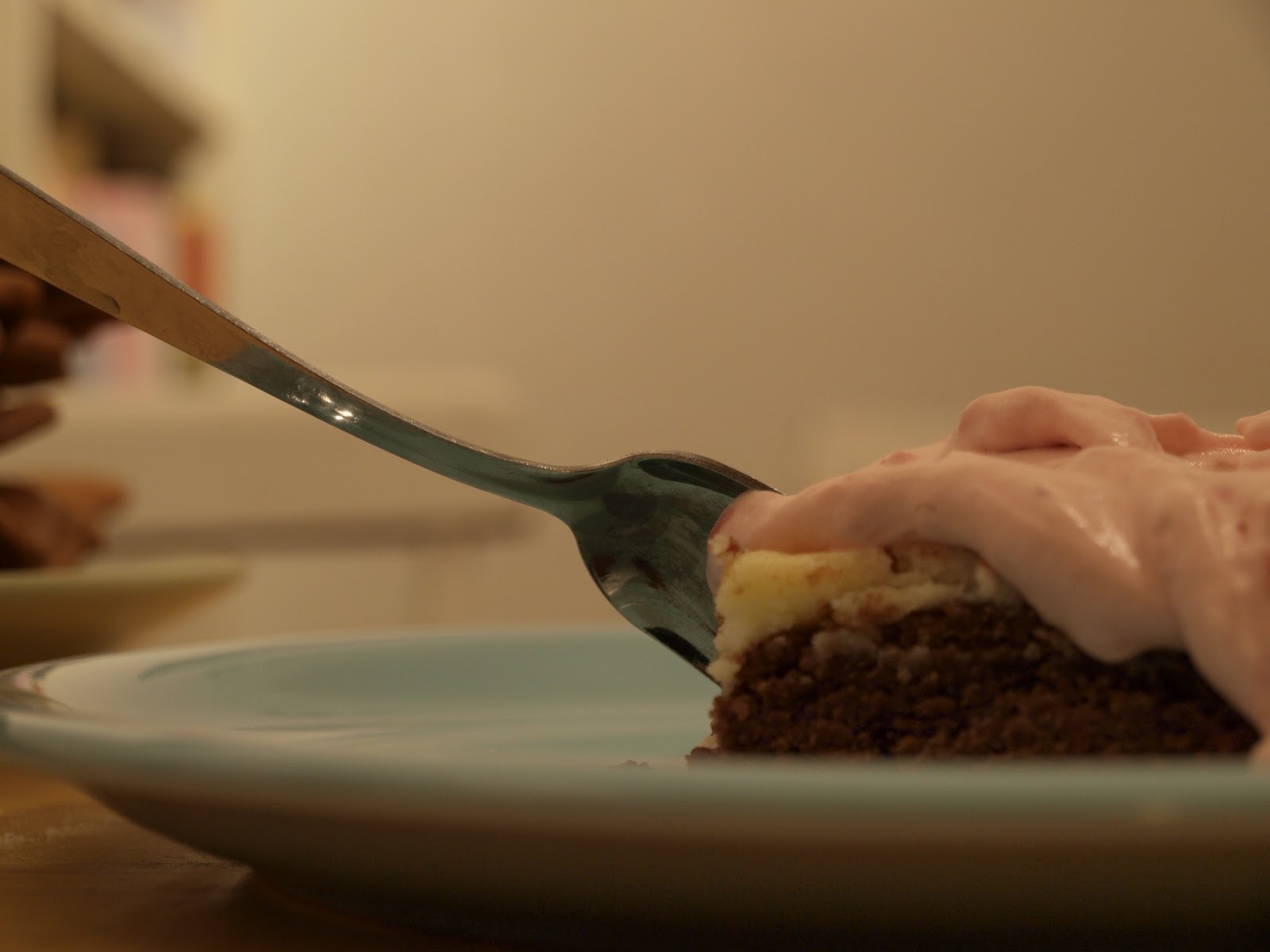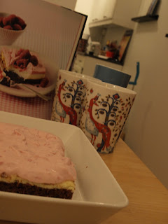 Heikin synttäreitä vietettiin nyt joulukuun alussa ja facebookin onnitteluissakin kommentoitiin, että kai se Emma leipoo jotain hyvää. Noh... kai se sitten leipoo :) Nykyisessä keittiössä kun on niin paljon enemmän tilaa kuin aiemmin, että mielelläni kokkailen ja leivon taas. Keittokirjaseinältä (ahh! Se on niiiiin ihana) valikoitui Hummingbirg bakery cookbook ja sieltä Kaikkea hyvää kerroksittain eli Rasperry cheesecake brownie, jossa alin kerros on brownieta, keskellä juustokakkua ja päällä vadelmaista kermavaahtoa. Ohjeen mukaan tuosta tulisi 12 hengelle, mutta kerrankin on niin päin, että tuosta riittää kyllä useammallekin, mie sanoisin, että 15 saa napansa täyteen.